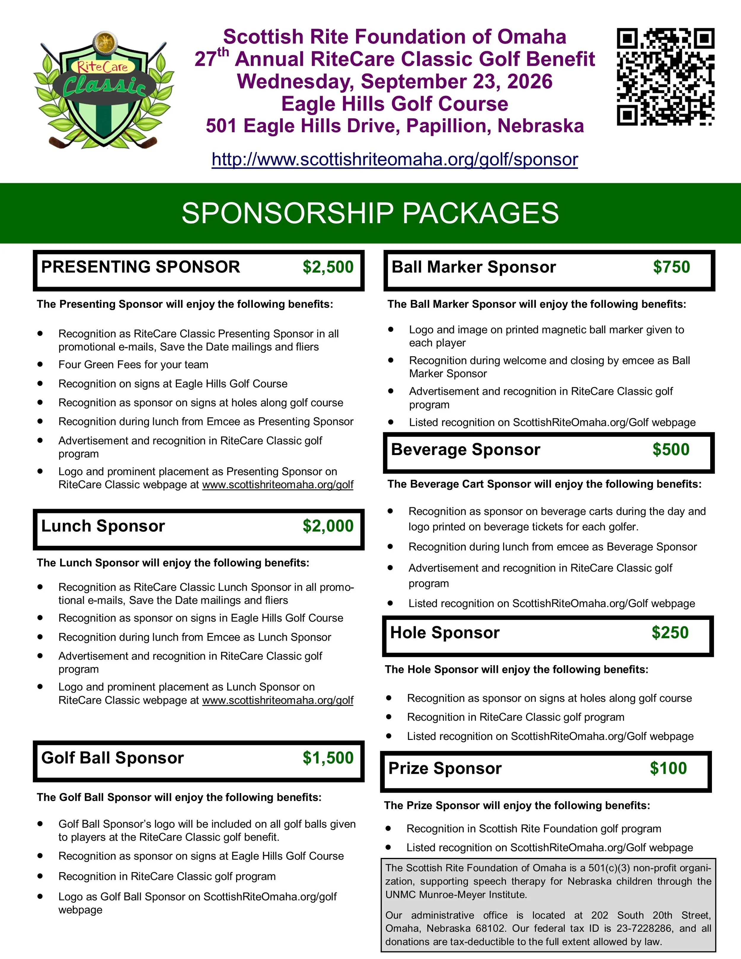 Thank you for considering sponsorship for the RiteCare Classic Golf Benefit, a fundraiser supporting the RiteCare Speech and Language Clinics and the Scottish Rite Foundation of Omaha.